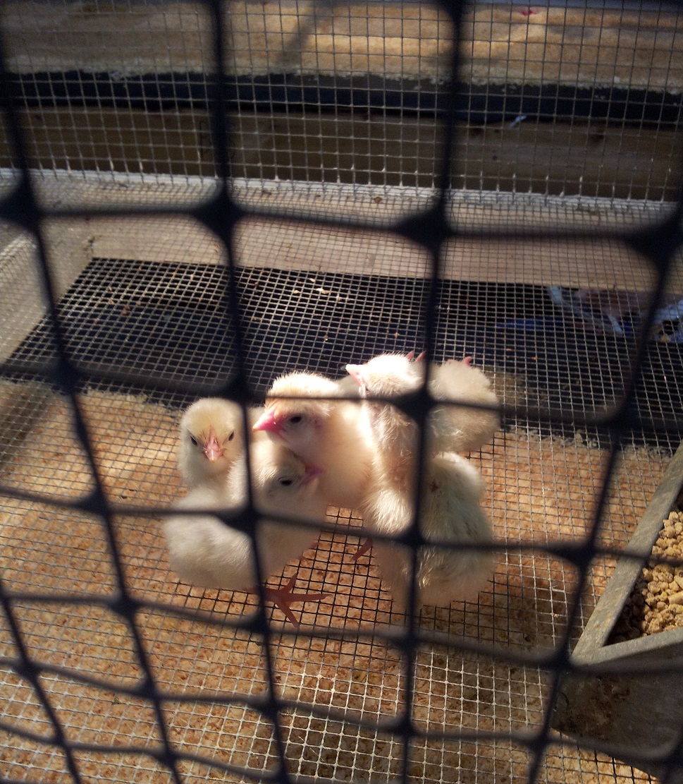 Great big cage, little pile of hyperkinetic chicks in the middle of it...
